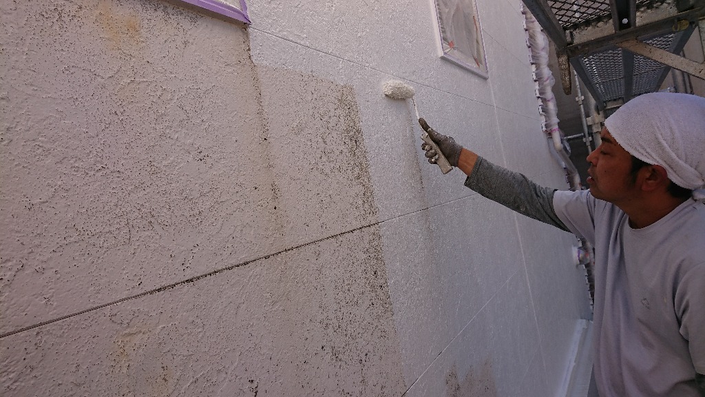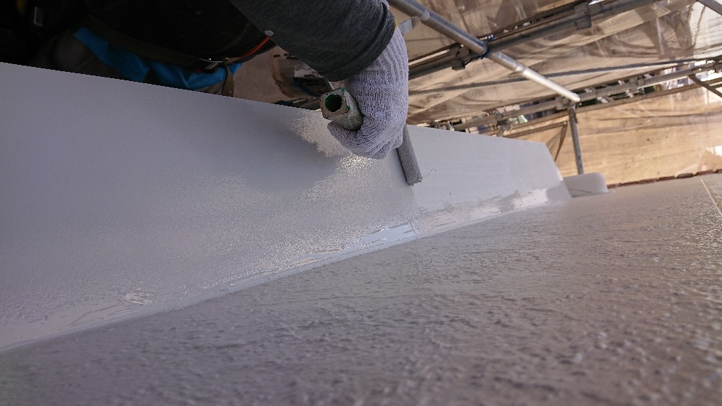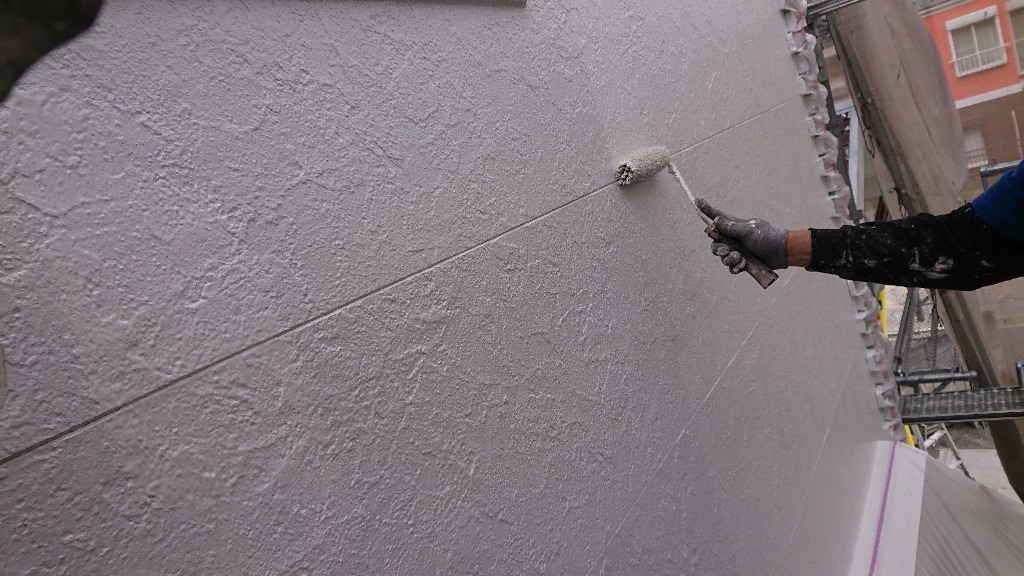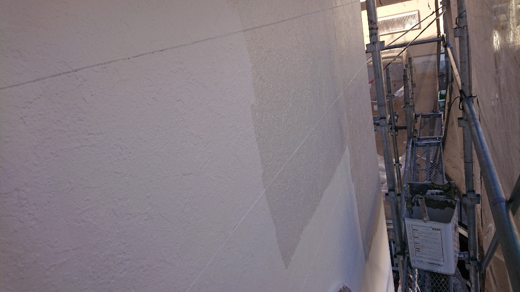 下塗り、中塗り、上塗りの3工程です。材料はSK化研のプレミアムシリコンを、使いました。
